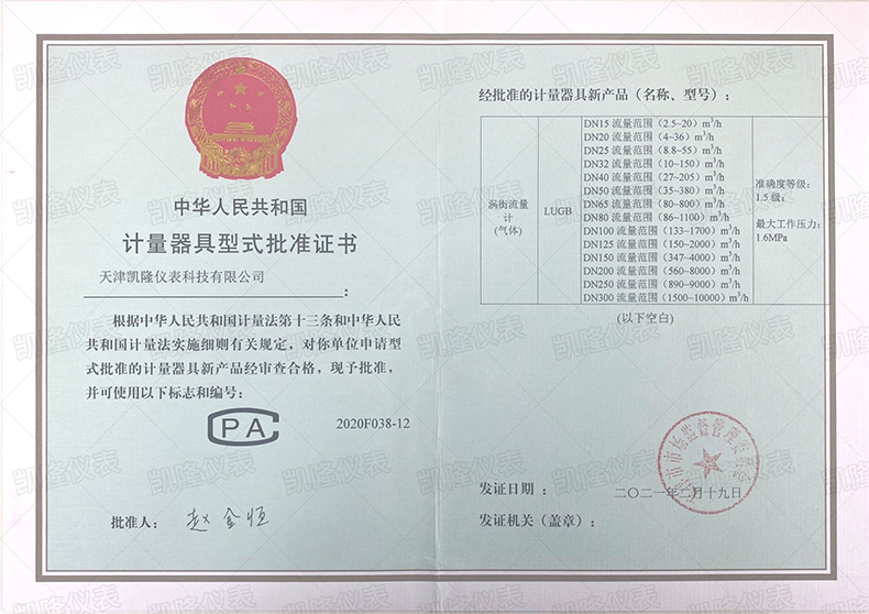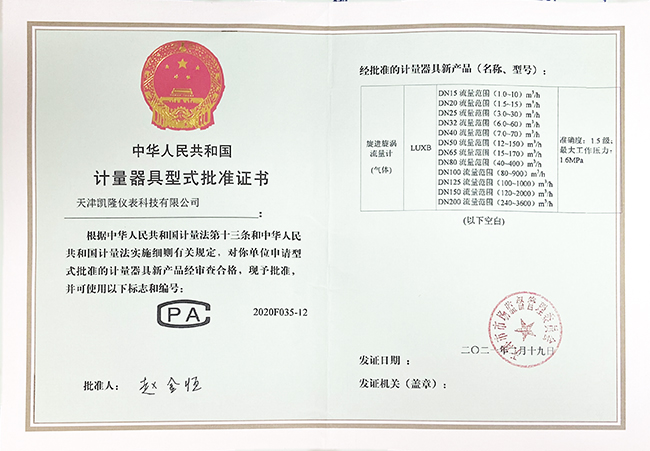 渦街流量計(jì)型式批準(zhǔn)證書